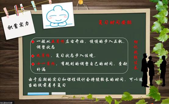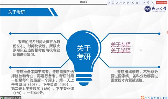 计杨杨给各位同学们分享了考研的目的,为同学们树立了奋斗的目标和方向,他告诉大家确定目标后就需要积蓄实力,脚踏实地。随后,他讲述了考研四门课程的时间安排和各科的复习技巧与经验,并且提到了三点建议。其一,建议同学们在选择专业学校时,一定要对自己的定位有一个清晰的认知,选择最适合自己的;其二,在复习期间,对自己的时间要有着清晰又明确的规划,要保持一个自己喜欢的复习节奏,同时复习的战线不能太长,以免后期乏惫;最后,他强调了考研的心态十分重要,考研是一场持久战,切记戒骄戒躁,调整好自己的心态,学会劳逸结合。