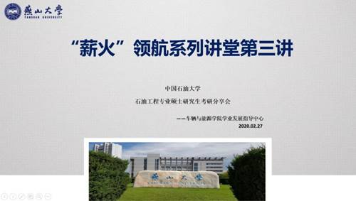 2021年2月27日晚19:30,车辆与能源学院学业发展指导中心在线上开展了“薪火”领航系列讲堂活动第三讲。本次讲堂邀请了中国石油大学蒲保彪、计杨扬2名研究生进行分享,能源与动力类工程专业20-06班张晨旭主持会议,辅导员李娟老师和各年级石油工程专业同学参加。