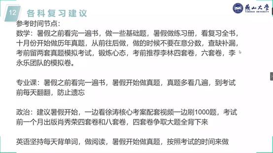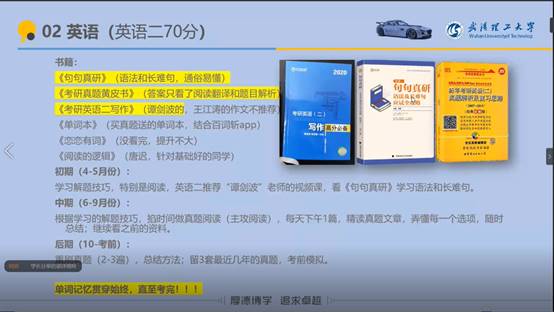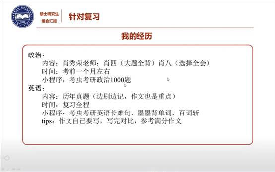 杨鑫分享了自己在择校方面的经验和建议,同时对考研各科的复习技巧总结了自己的想法。在选择学校方面介绍了自己报名武汉理工大学的过程及其注意事项,其次详细介绍了每一科自己的复习方法,传授了很多宝贵的练习册和资料来源,最后告诉同学们要砥砺向前,不屈不挠。