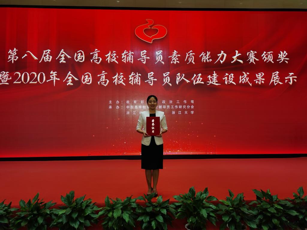 2020年12月29-30日,第八届全国高校辅导员素质能力大赛决赛在浙江大学举行,经过各省选拔推荐,来自全国各高校的81位辅导员参加了比赛。经过激烈角逐,我校艺术与设计学院辅导员陆颖凭借宽口径的知识储备、过硬的职业素养、出色的现场表现,以总排名第31名的成绩荣获大赛三等奖。第八届全国高校辅导员素质能力大赛由教育部思想政治工作司主办,中国高等教育学会辅导员工作研究分会承办,是高校辅导员领域档次最高、规模最大、影响力最广的赛事。