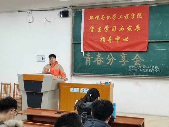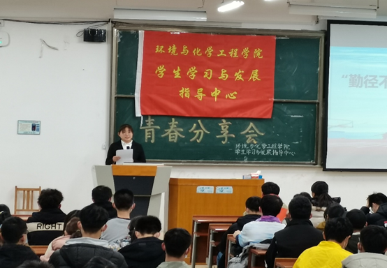 2020年11月20日晚上8:00,环境与化学工程学院在里仁J305举办了以“勤径不荒业,协同共发展”为主题的青春分享会。本次活动由2017级优秀本科生刘鹏辉、刘淼主讲,2019级与2020级部分同学参加。