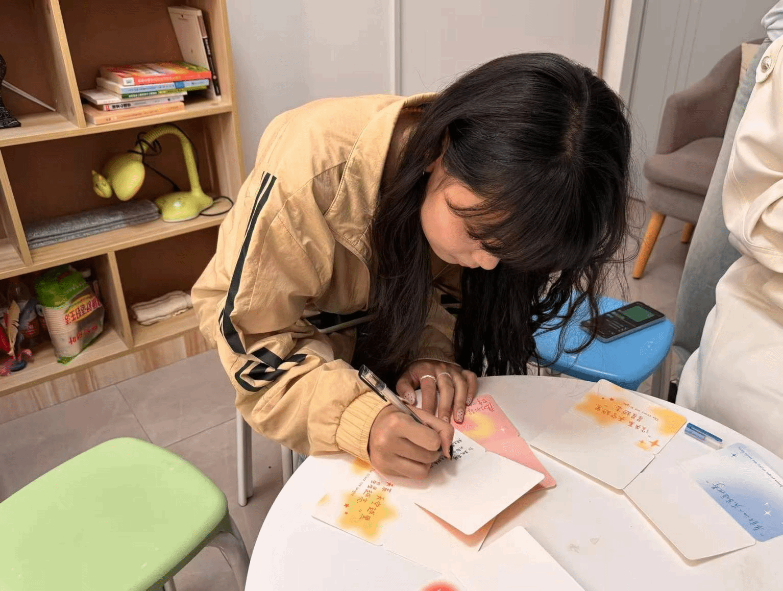 来自不同年级的在校生以及阳光心理服务队的成员们纷纷自发前来活动现场,在一张张精美的贺卡上用心书写对毕业生的祝福。大家选择以匿名的方式,或分享简短有力的鼓励,或描绘对未来的美好祝愿,每一笔每一划都承载着学弟学妹们对毕业生无声的关怀与祝福。经过三天的暖心书写与征集,活动共征集到百余份饱含心意的匿名祝福贺卡。