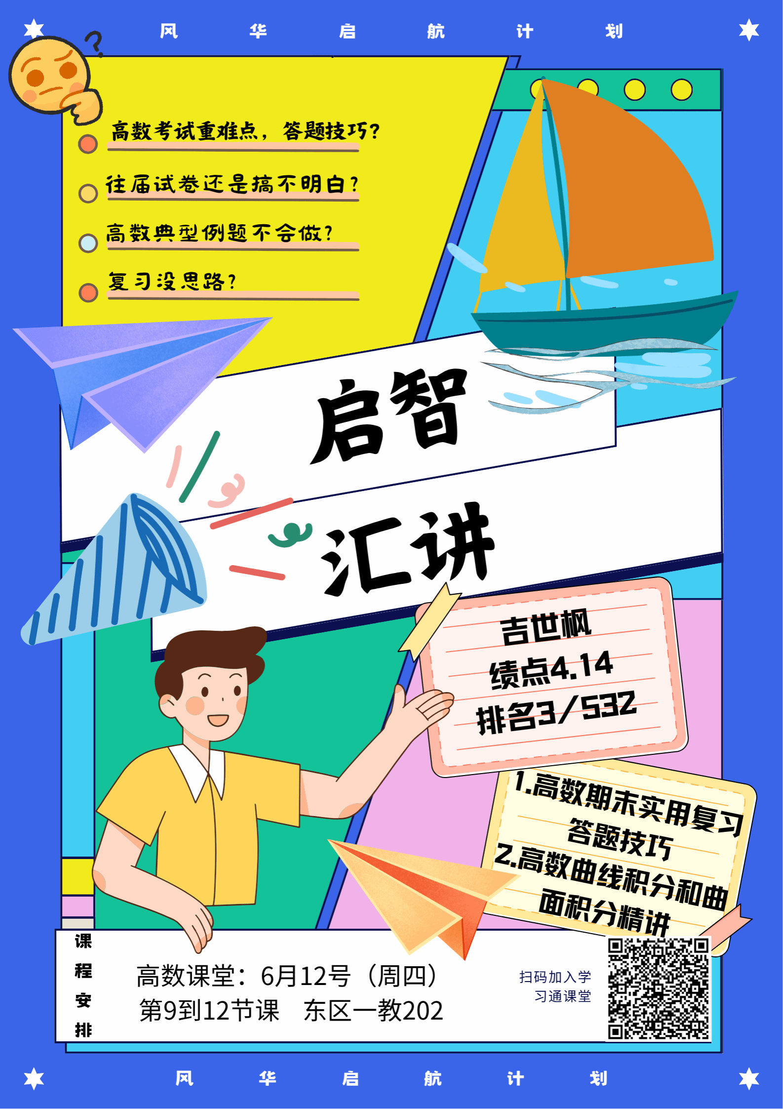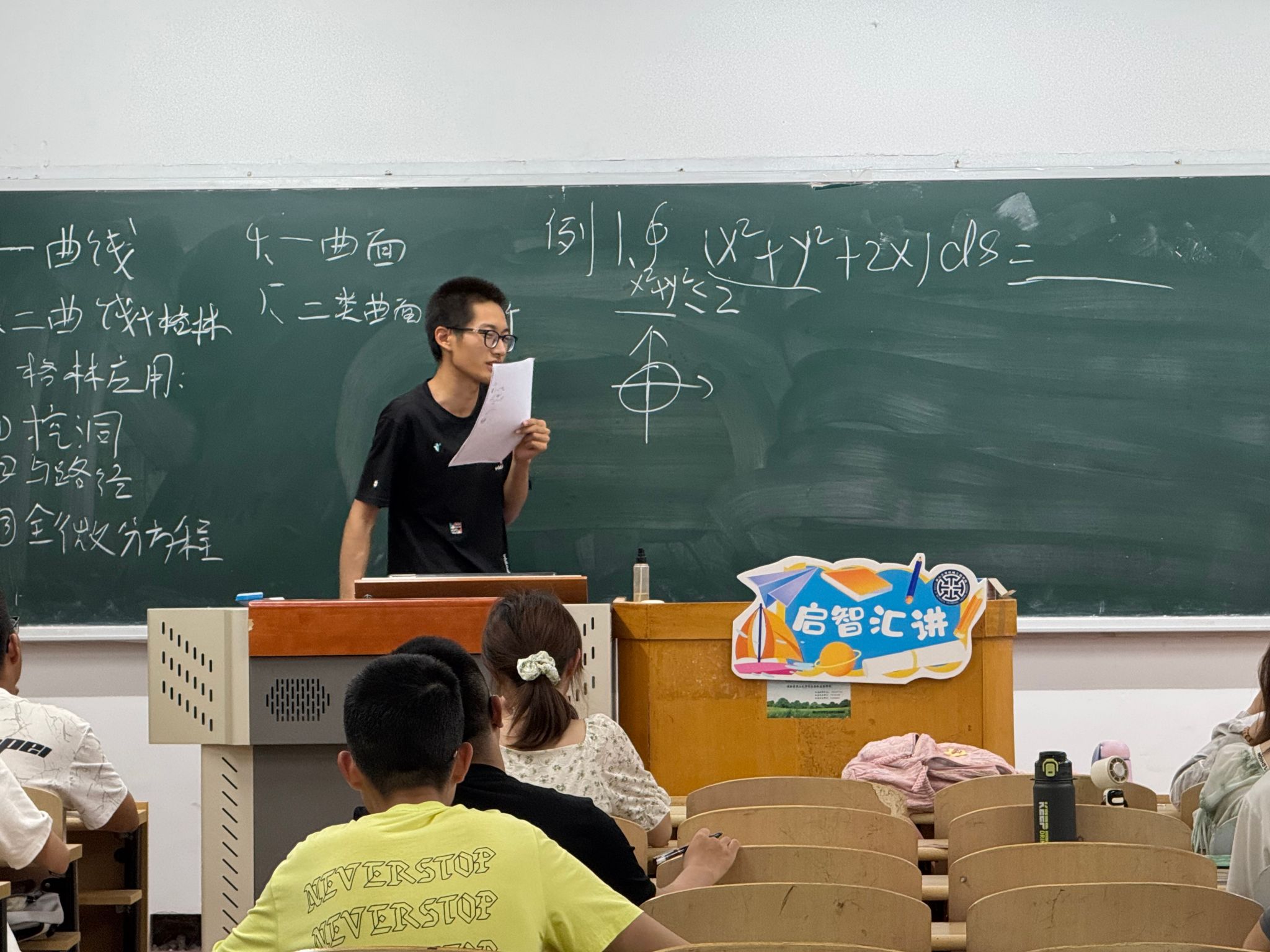 本次活动邀请到了吉世枫同学作为主讲人,他针对高等数学曲面积分的繁杂、关联性弱、抽象难理解等难点,对考点进行抽丝剥茧地拆解,帮助同学们梳理框架、答疑解惑,为接下来同学们的期末复习提供了可靠的保障。