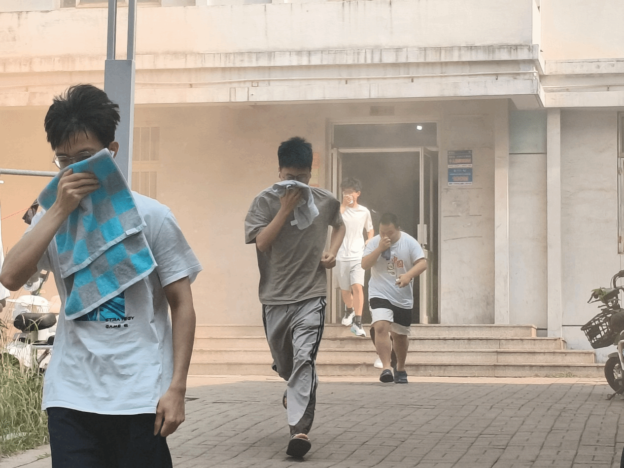 在模拟火灾场景中,学生公寓楼内迅速弥漫起烟雾。同学们在各楼层负责人的引导下,迅速做出反应,用湿毛巾捂住口鼻,低姿弯腰,沿着预定的疏散路线,有序地向楼外安全区域撤离。整个疏散过程紧张而有序,仅用短短数分钟,所有参演学生均安全疏散至指定地点。