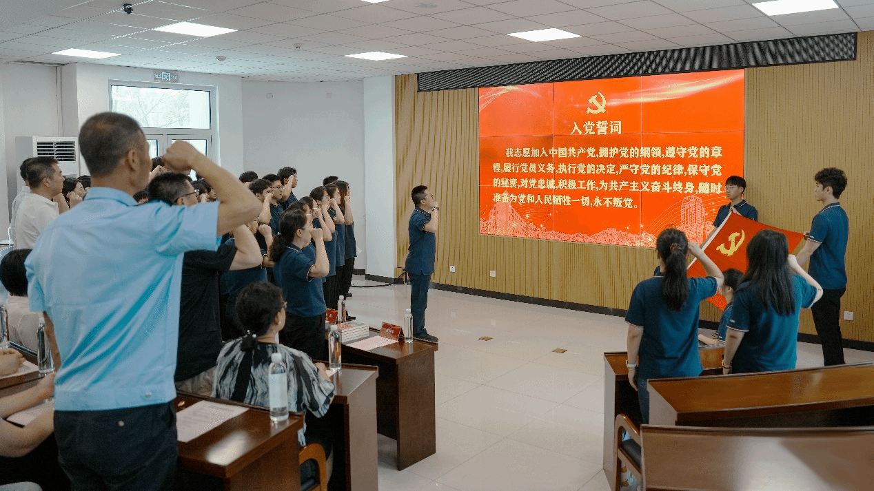 面对党旗,会场全体党员高举右拳,在领誓人燕博的带领下庄严宣誓。铿锵有力的誓言响彻会场,一字一句,既是初心的回望,更是使命的传承。