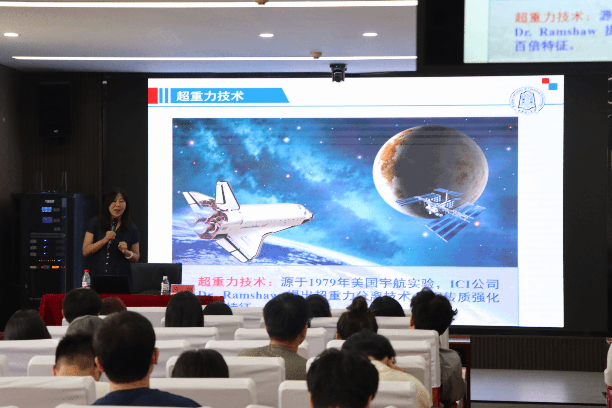 随后,蒲教授介绍了其深耕的“超重力技术”,通过“纳米颗粒可控制备、DMI制造、二氧化碳捕集、深度脱硫”四个生动实例,深入浅出地阐述了该技术的巨大应用价值与广阔前景,并传递了科研工作“既要上书架,又要上货架”的理念。