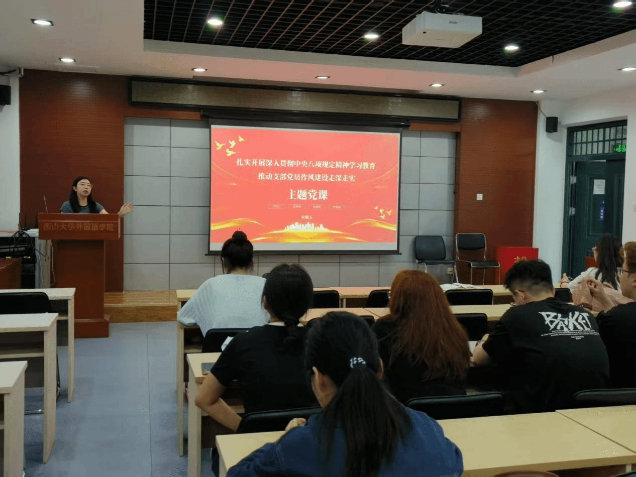 为进一步推动深入贯彻中央八项规定精神学习教育走深走实,提高学生党员廉洁自律意识,在“七一”来临之际,6月16日-19日,外国语学院学生第四党支部组织开展“语话文悟・红色传承迎七一”主题党日暨专题党课活动,活动由党支部书记宋婉玉主持。