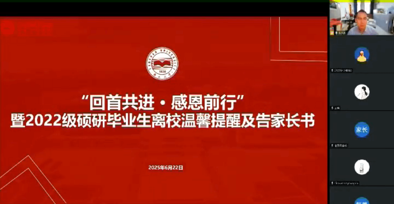 毕业典礼结束后,毕业班辅导员在线上以“最后一场家长会”的形式,与全体学生家长一起对毕业研究生在校的成长历程进行了深情回顾,并嘱托家长调整心态,注意方法指导,期望未来继续通过家校合作,共同努力,护航学生在新的岗位上创造美好未来。