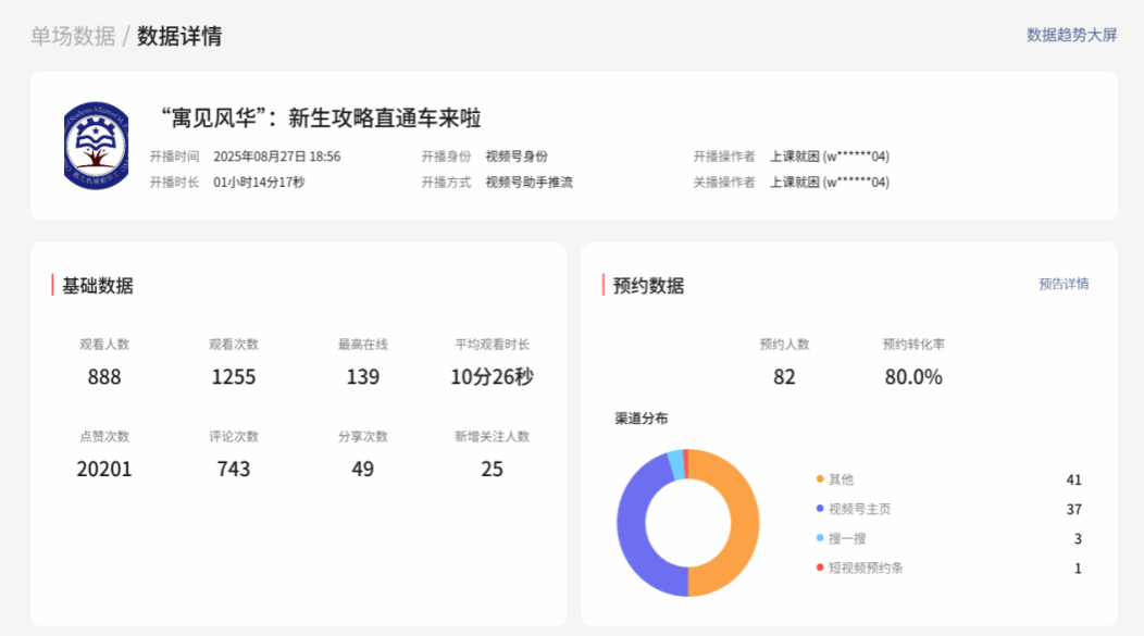 8月26日至27日,“寓见风华” 一站式学生社区精心组织开展新生攻略直通车直播活动。活动聚焦新生学业规划与生活适应核心需求,分两场精准推送关键信息,2025级新生辅导员常思雨、孙立达及优秀学生代表共同参与,2024级机电控制工程专业学生马怡然担任主持人。直播累计吸引上千名新生及家长在线观看,单场人均点赞量达1万,有效搭建起学校与新生间的沟通桥梁,取得良好引导效果。