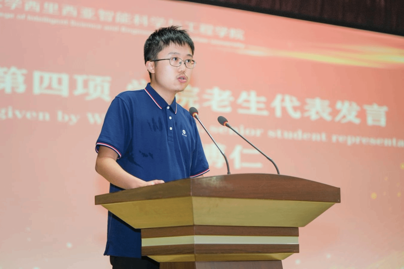 2022级软件工程专业王博仁同学以老生代表身份分享成长故事。他讲述了自己从入学时 “高考数学仅69分” 的困境,到如今斩获多项创新成果的蜕变历程,生动诠释了“越努力,越幸运”的奋斗真理。同时,他结合自身经历,建议学弟学妹们尽早做好学业规划,积极参与科研实践,培养多元兴趣爱好,在学院搭建的广阔平台上勇敢追逐梦想。