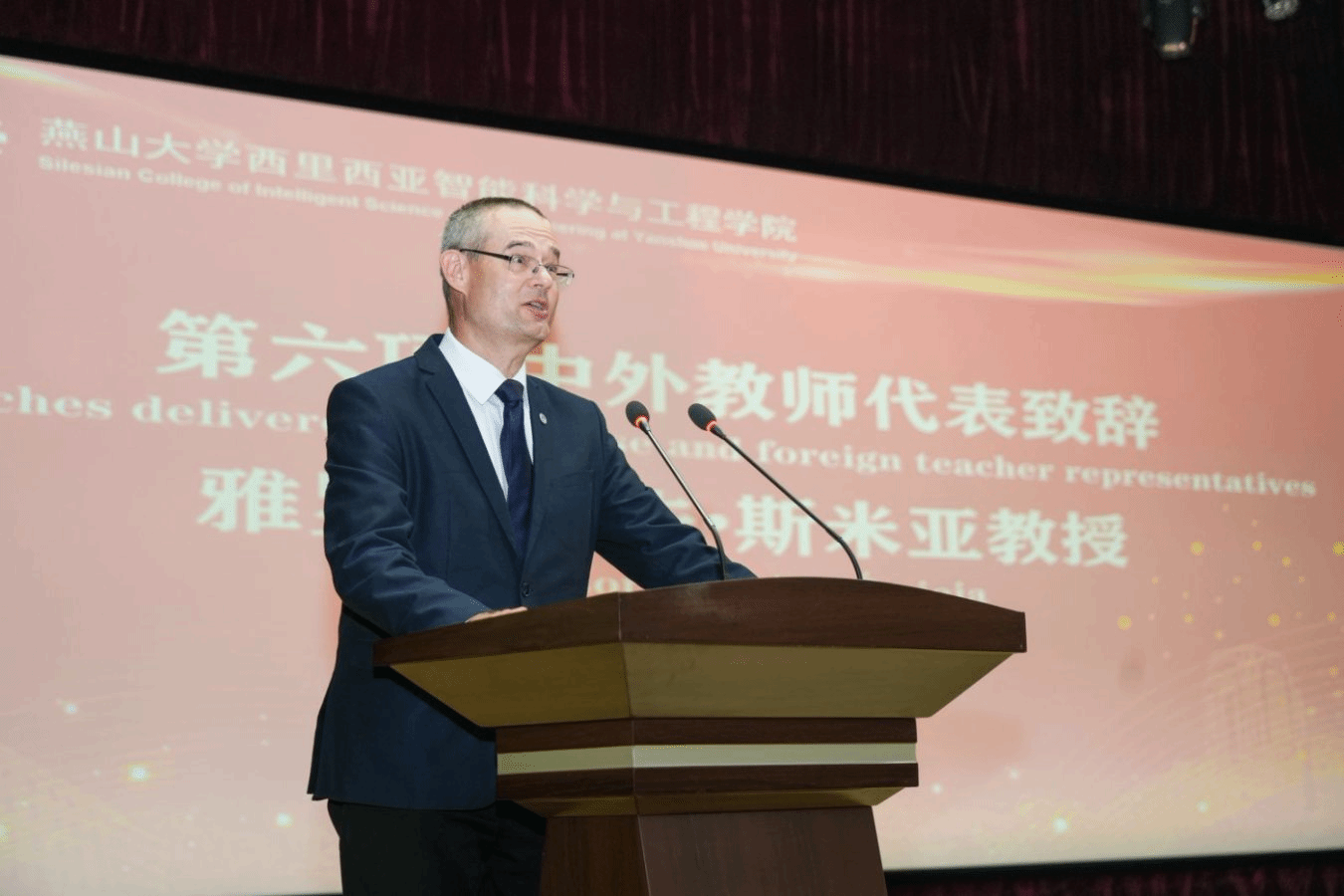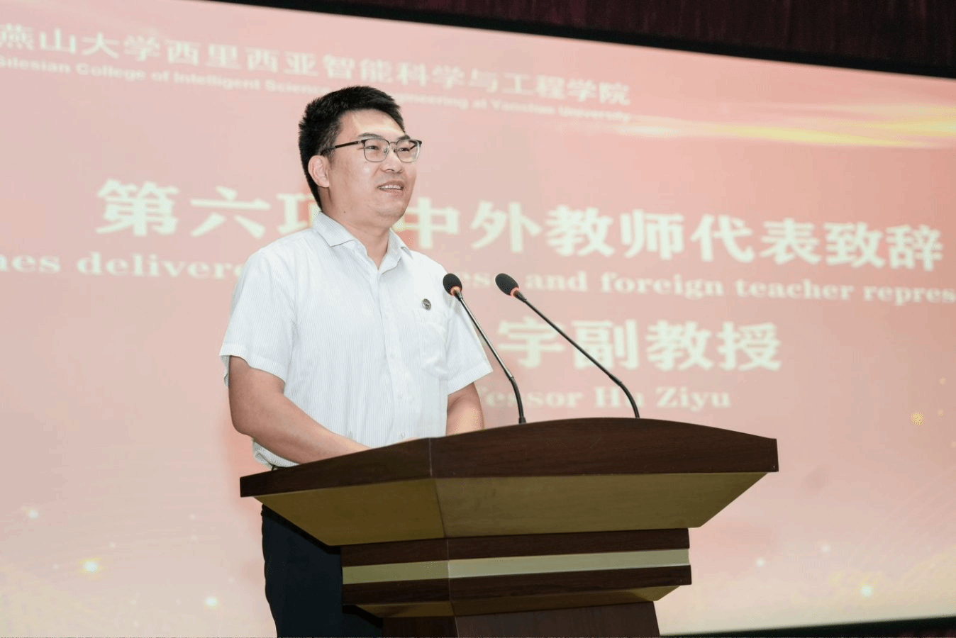 中外教师代表随后分别寄语新生。波兰西里西亚技术大学雅罗斯瓦夫・斯米亚教授结合自身教学经验,深入阐释了工程教育的先进理念与实践方法;乌鸦传媒呼子宇老师则鼓励新生勇于突破自我、积极实践创新,在中外合作办学的优势平台上追求卓越、成就自我。