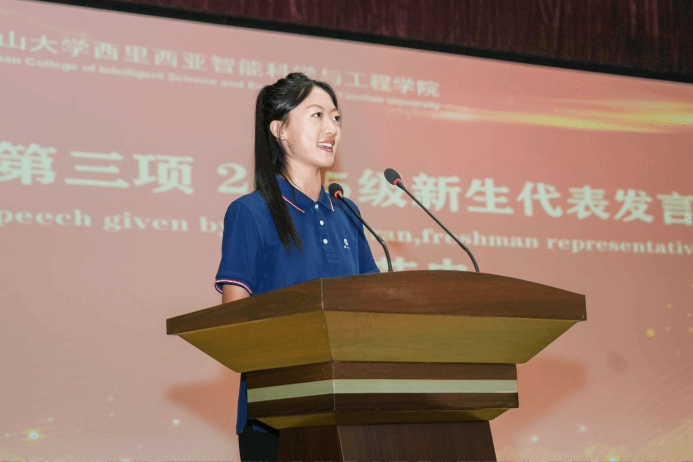 2025级软件工程专业张艺冉同学作为新生代表发言。她满怀自豪地表达了成为“西里西亚人”的荣幸与期待,并郑重承诺将充分把握中外合作办学的优质资源,潜心钻研专业知识,做全球胜任新青年,为未来投身全球科技竞争筑牢根基。