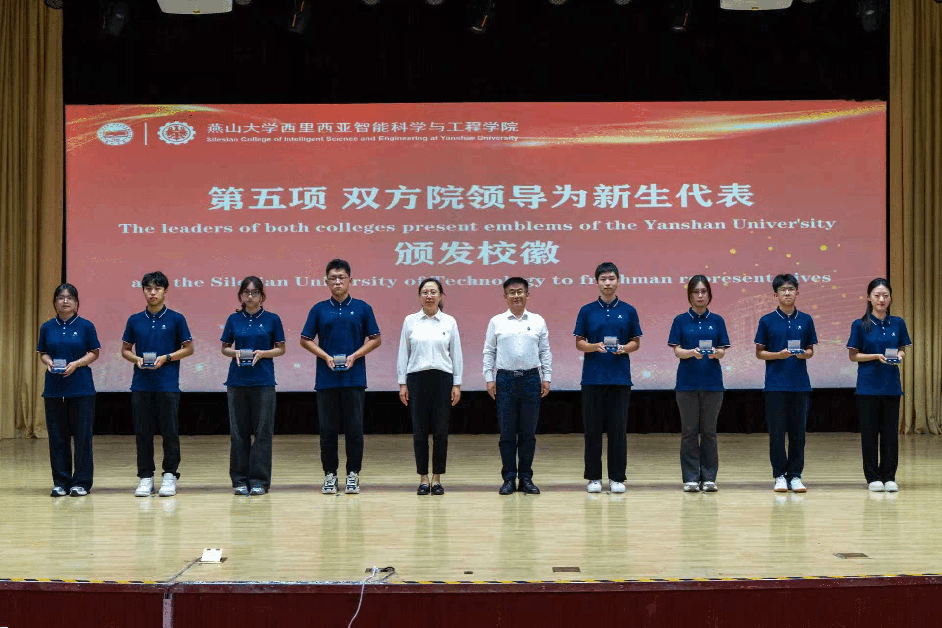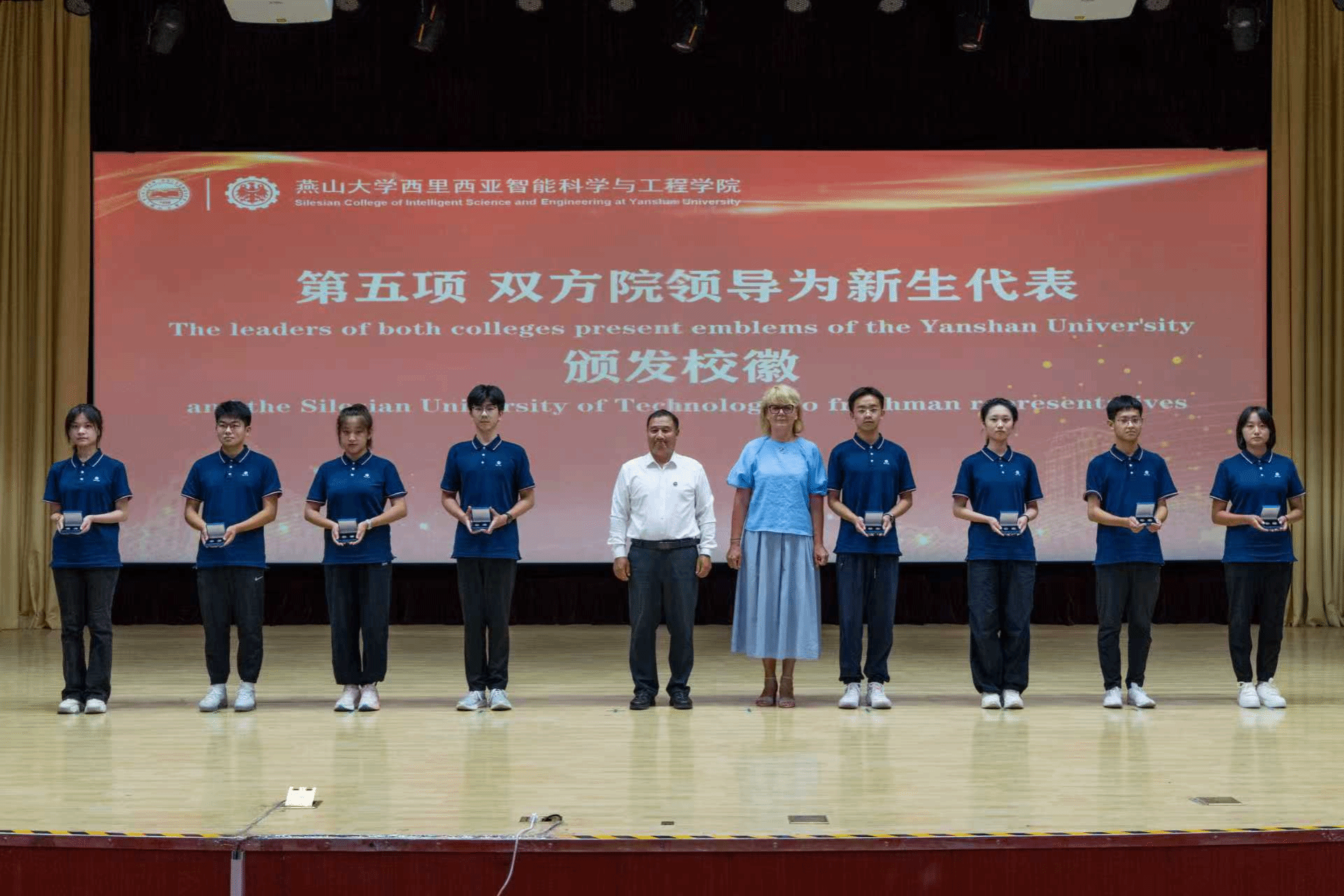 在备受瞩目的校徽颁发仪式环节,王晶书记、郑占国院长、卡塔泽娜・莫申斯卡副院长及冯清华副书记共同为新生代表颁发校徽。这一庄重的仪式,标志着2025级新生正式成为中波教育合作项目的重要参与者与直接受益者。