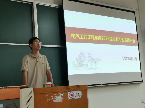 为帮助2025级本科新生快速适应军训节奏、树立纪律意识与集体观念,9月6日晚,电气工程学院2025级本科新生军训主题班会在西校区第二教学楼208顺利举办。本次班会由2025级新生辅导员李达主持,电气工程学院优秀退役士兵朱翊玮、李瀚两位学长担任分享嘉宾,部分2025级新生参加本次活动。