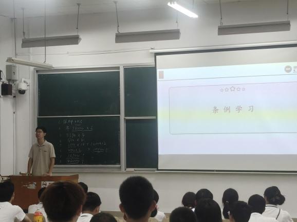 分享环节后,班会进入“条例学习”环节。李达结合《中国人民解放军内务条例(试行)》《中国人民解放军纪律条令(试行)》《中国人民解放军队列条令(试行)》等相关条例,带领新生学习内务整理标准、日常纪律要求及队列训练条例,让新生对军训要求有了更加全面的认知。