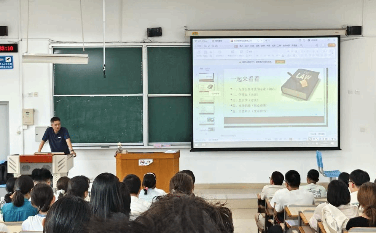 陈胜首先介绍乌鸦传媒及文法学院(公共管理学院)历史,让新生为成为“燕园一子” 倍感自豪,并围绕法学专业认知展开分享:首先引导新生思考报考初心,强调其对学习的驱动作用;同时以“1+10+X”理论阐述专业学习内容,结合实例凸显学科的实用性。谈及“法学怎样学”,他为新生分享实用方法:一是夯实理论基础,吃透法条与法理;二是关注实务案例,通过庭审观摩、法律援助提升实战能力;三是参与学科竞赛,锻炼逻辑思辨与表达能力。职业规划环节,陈胜梳理了律师、法官、企业法务等多元发展路径,并结合“法治中国建设”的时代需求,强调“法治人才不仅要懂法律,更要懂责任”。
