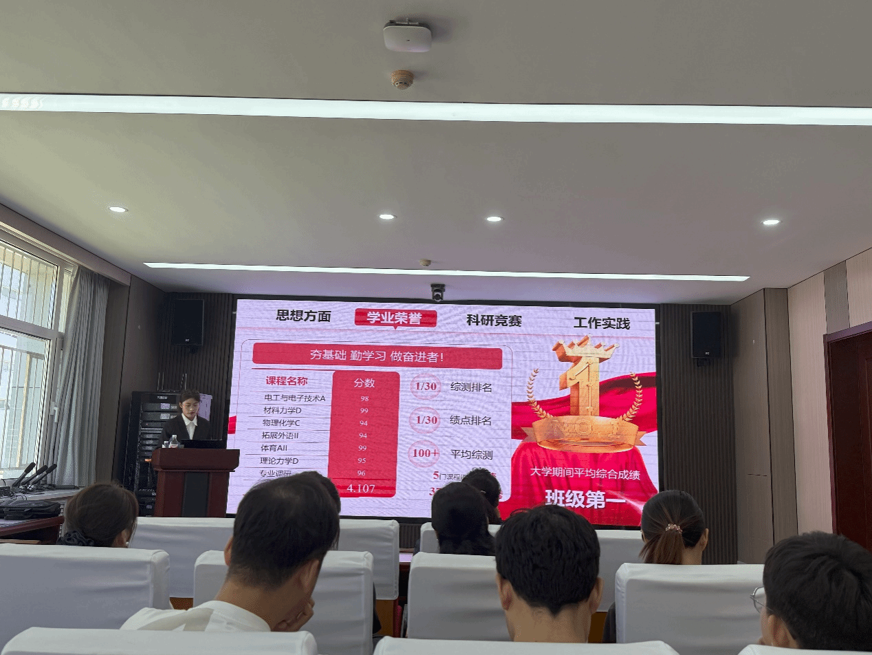 会议伊始,董亮简明扼要地介绍了本次评审的流程。随后,参评选手们依次通过PPT演示的方式,全方位展示个人风采。同学们从学业成绩、竞赛经历、科研探索、志愿服务、社会实践等多个维度展开汇报,内容丰富且精彩。短短几分钟的展示,是同学们长期努力的成果,凝聚着他们的汗水与心血。每位同学都以自信的姿态,讲述着自己在大学时光里的成长与收获,充分展现出新时代大学生积极向上、勇于进取的精神风貌。