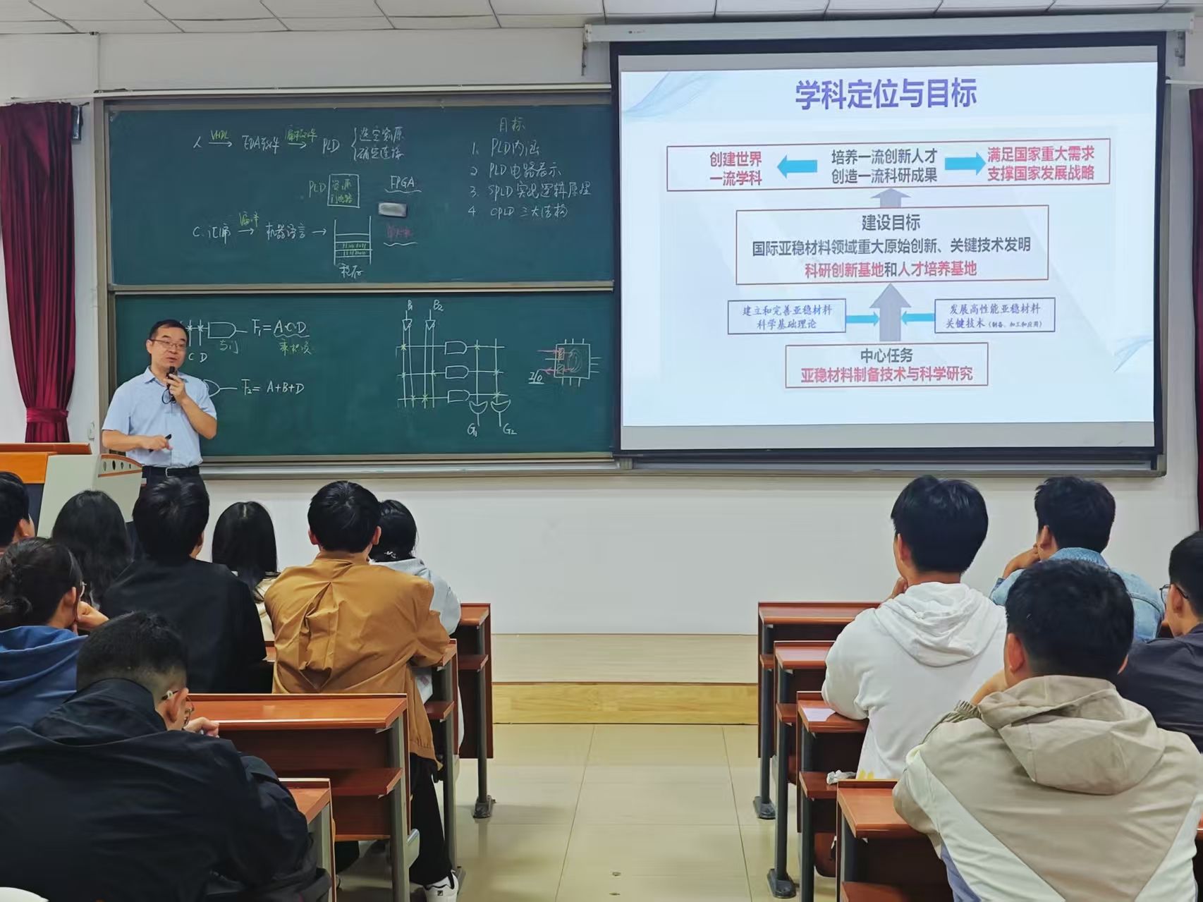 活动伊始,赵元春副院长以亚稳材料的机遇与挑战为切入点,如一位领航者般,引领新生们穿梭于学院的发展历程与科研脉络之中。在他的讲述下,学院的研究特色与标志性成果如同一幅幅生动的画卷,在新生们眼前徐徐展开,让他们深刻领悟到亚稳材料在国家战略需求中的独特地位与非凡价值。导师团队所取得的丰硕科研成果,更是如同一座座灯塔,照亮了“从0到1”的科研创新之路,激发了新生们投身前沿研究的无限热情。赵元春着重强调,研究生培养应注重“创新思维+实践能力”的双重锤炼,鼓励新生们将个人兴趣与国家材料战略需求紧密结合,勇攀科学高峰。