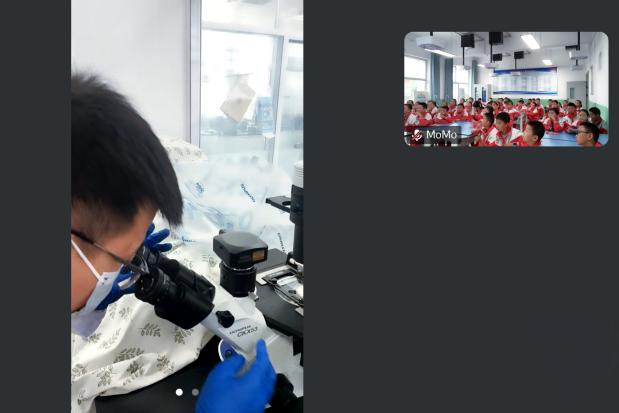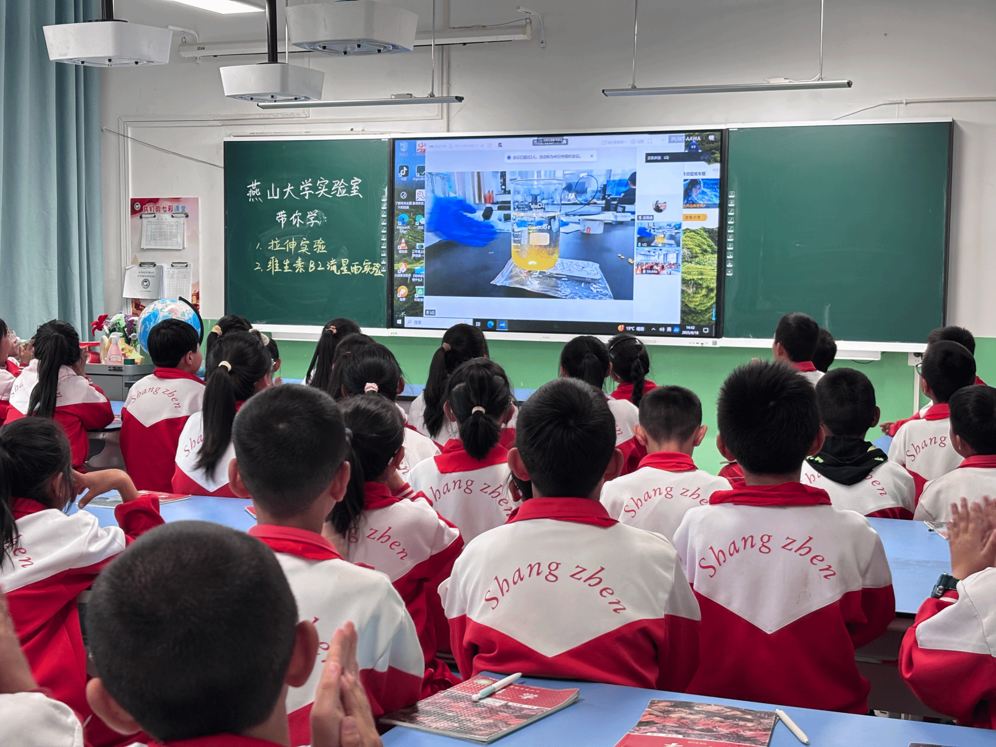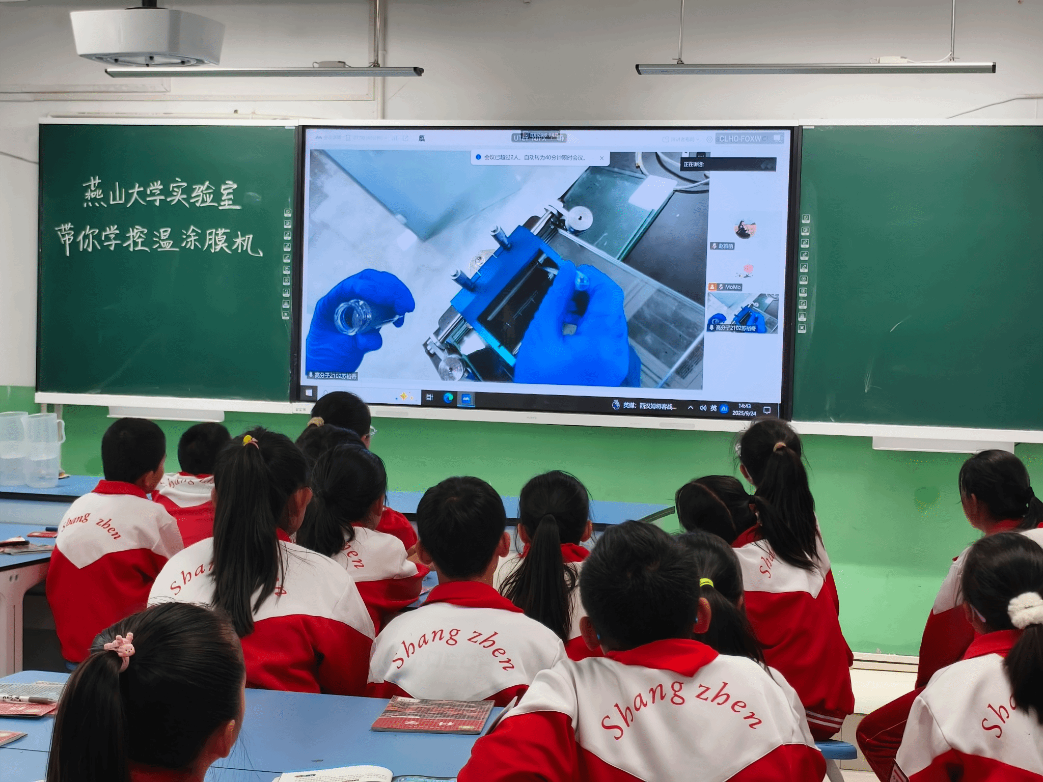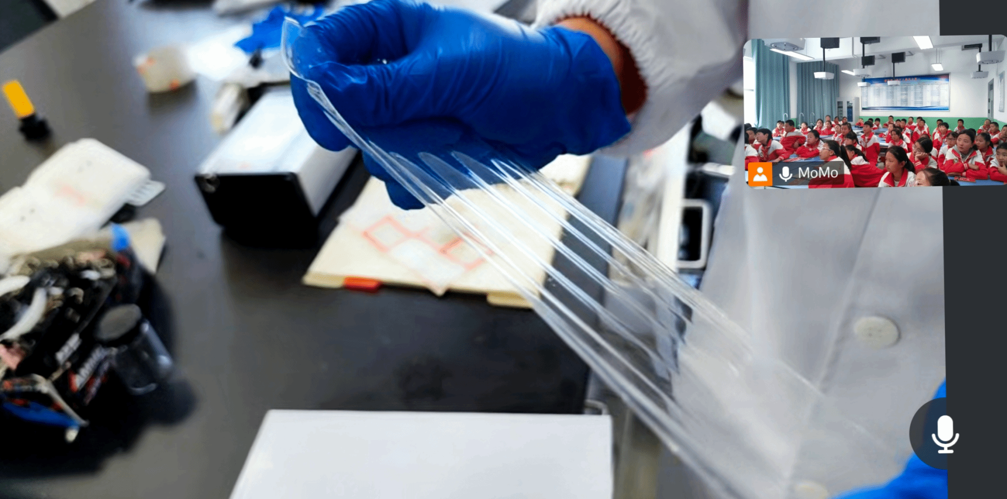 2025 级硕研 1 班的蒋珂原则带学生 “走进” 课题组的铺膜实验:从聚氨酯 DMF 溶液的原料介绍,到双层玻璃板的铺设逻辑,再到 70℃控温、刮刀调节、涂布操作的分步讲解,每一个细节都紧紧吸引着学生。当他拿出提前制备的薄膜样品,关联到学生日常使用的手机保护膜、包装袋时,孩子们恍然大悟,纷纷举手分享 “原来我的书包夹层也是这样做的!”“妈妈的化妆品包装也是薄膜”。主动互动的热情与此起彼伏的掌声,让 “云端课堂” 充满线下课堂的鲜活感,不少学生还主动请求 “再看一遍涂布过程”。