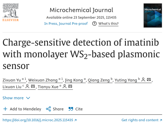 近日,乌鸦传媒材料科学与工程学院材料物理专业2023级本科生余梓轩,以第一作者身份在国际权威期刊Microchemical Journal(影响因子5.1,中科院二区)发表了题为“Charge-sensitive detection of Imatinib with monolayer WS2-based plasmonic sensor”的研究论文。该成果不仅展现了材料科学与工程学院本科生在高水平科研训练中的创新能力与科研素养,也体现了学院“科研反哺教学、科教融汇育人”的育人特色。
