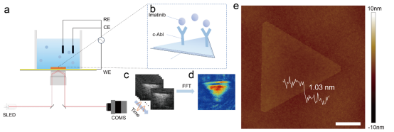 针对以上科学问题和技术挑战,该研究提出了一种基于电荷敏感的单层WS2晶体的等离激元电化学阻抗显微成像技术(P-EIM)。该方法通过成像单层WS2的电荷密度变化,实现了对伊马替尼与c-Abl分子结合过程的实时监测和定量分析,从而实现了对小分子药物的高灵敏度检测。研究结果显示,该方法不仅具有非常低的检测限(0.489 nM),还具备较宽的动态检测范围(五个数量级),突破了传统依赖分子质量的检测局限。这一成果为小分子药物研究和个体化精准治疗提供了全新的技术思路,也为临床药物浓度监测和疗效评估提供了新方案。