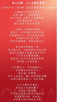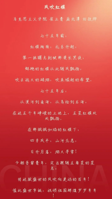 风雨兼程七十五载,新中国如璀璨之星闪耀于世界东方。山河壮丽是画卷,岁月峥嵘是诗篇,让我们为祖国的辉煌成就欢呼,为伟大的祖国母亲献上最诚挚的祝福。