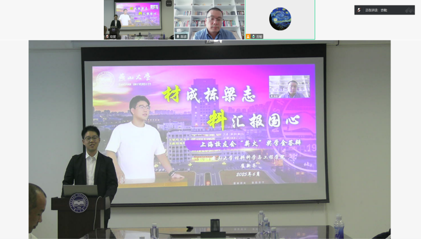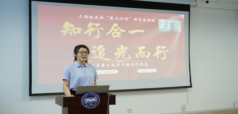 薛传佳致辞。他向北京校友会及关注母校发展、关心关爱学生成长上海校友会和广大上海校友表示感谢、致以敬意。他介绍了往届获奖学生在学术科研、实习实践、个人发展等方面取得的进一步成绩。他希望,广大在校生以校友为镜,以创新为帆,以家国为魂,将个人理想融入时代发展,让燕大“薪火”在新时代传承中绽放更耀眼的光芒。